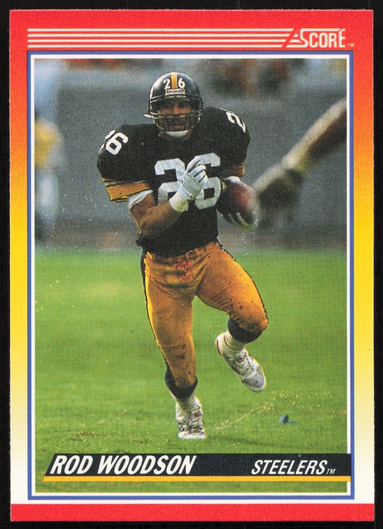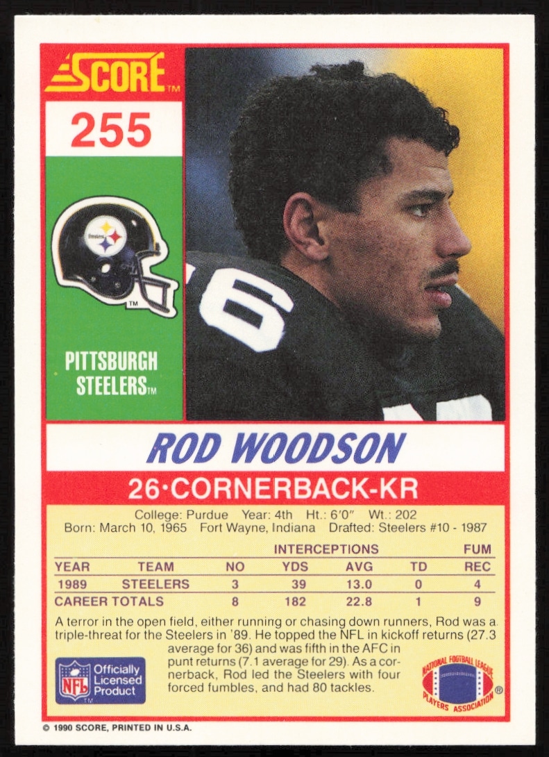 This Football card, from 1990 is part of the Score card set. Rod Woodson is featured and has a card number of 255.