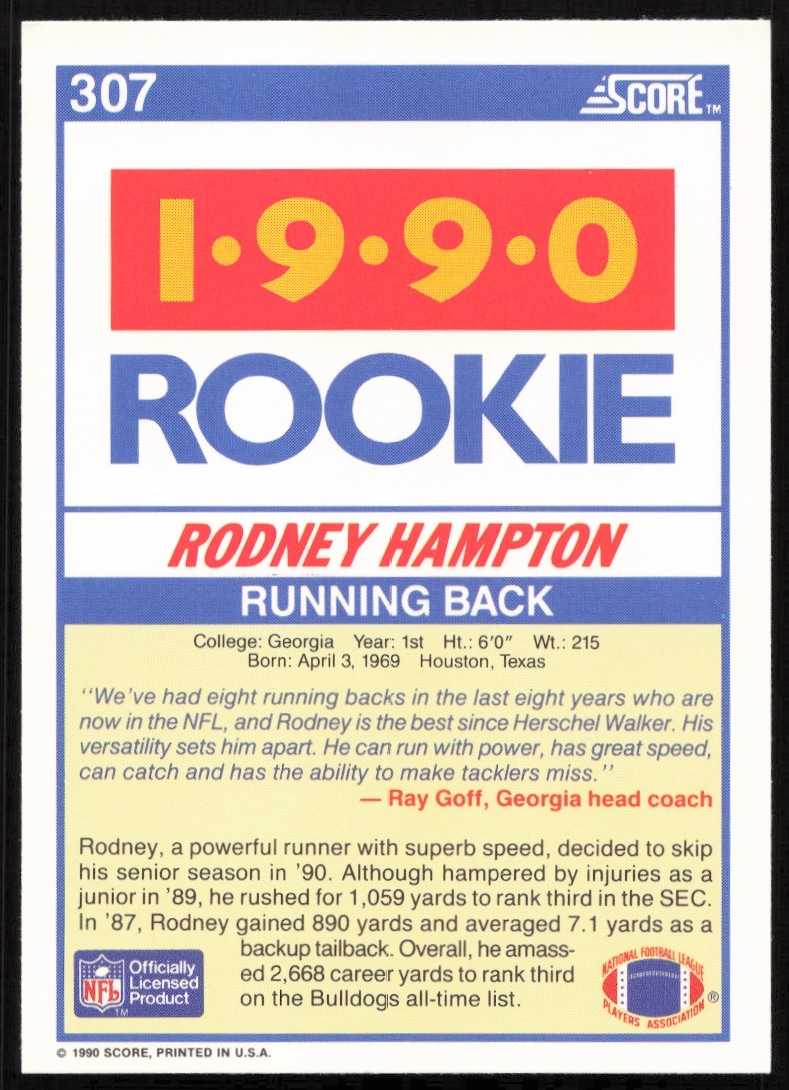 This Football card, from 1990 is part of the Score card set. Rodney Hampton is featured and has a card number of 307.