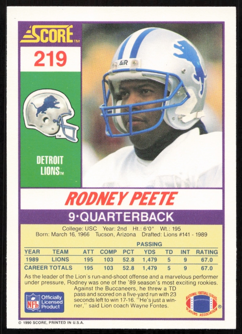This Football card, from 1990 is part of the Score card set. Rodney Peete is featured and has a card number of 219.