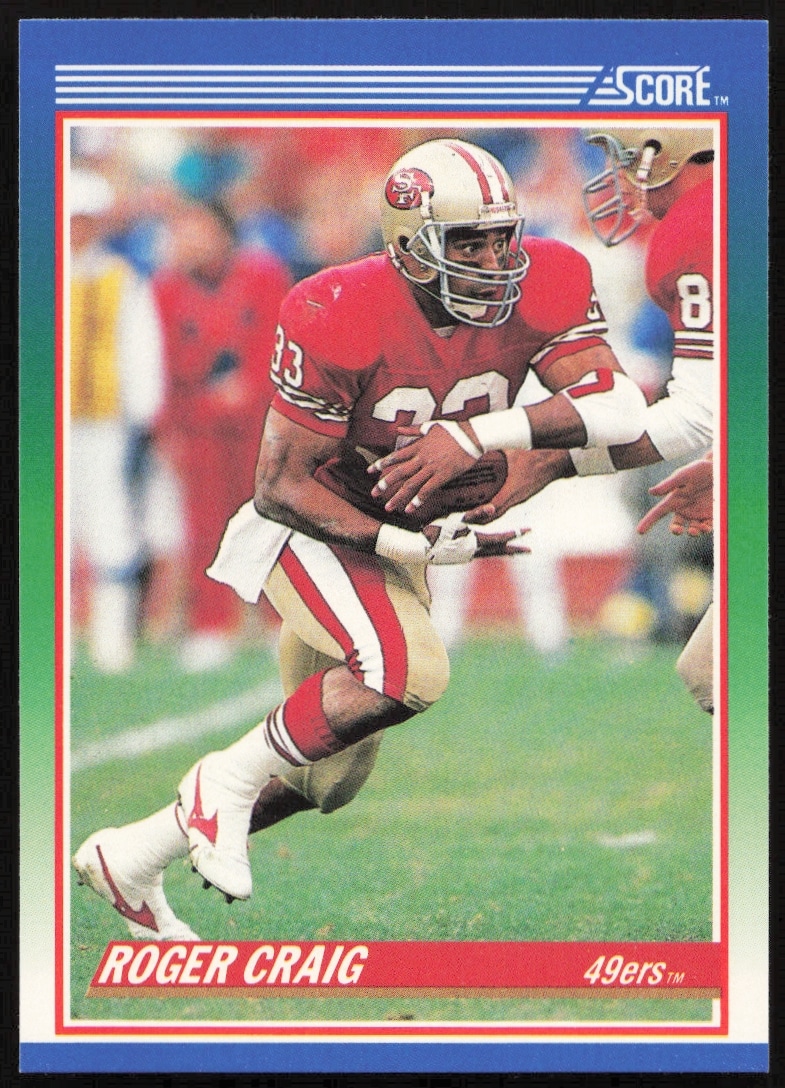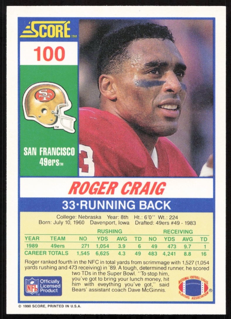 This Football card, from 1990 is part of the Score card set. Roger Craig is featured and has a card number of 100.