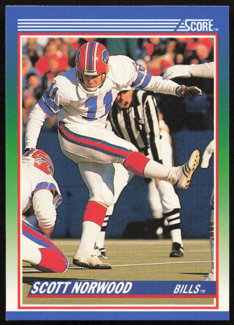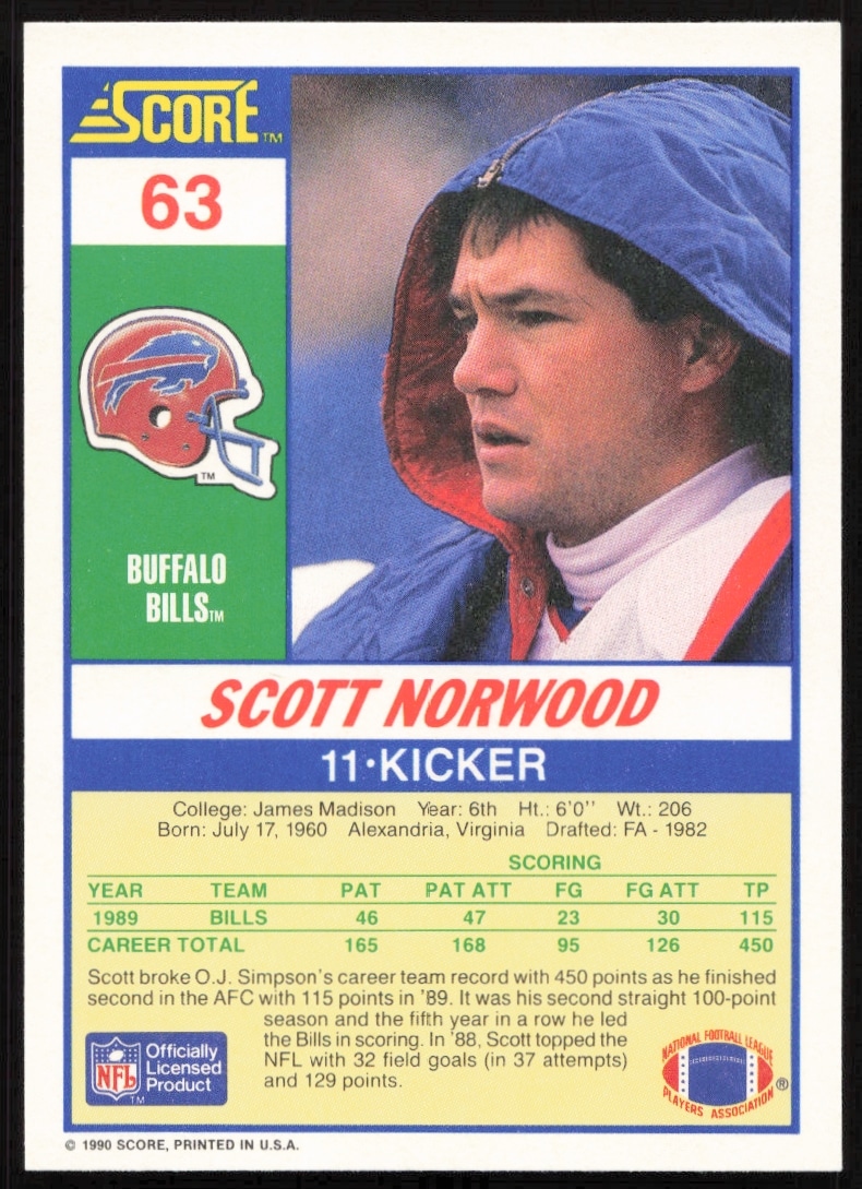 This Football card, from 1990 is part of the Score card set. Scott Norwood is featured and has a card number of 63.