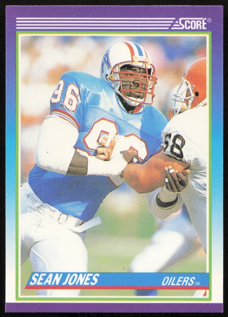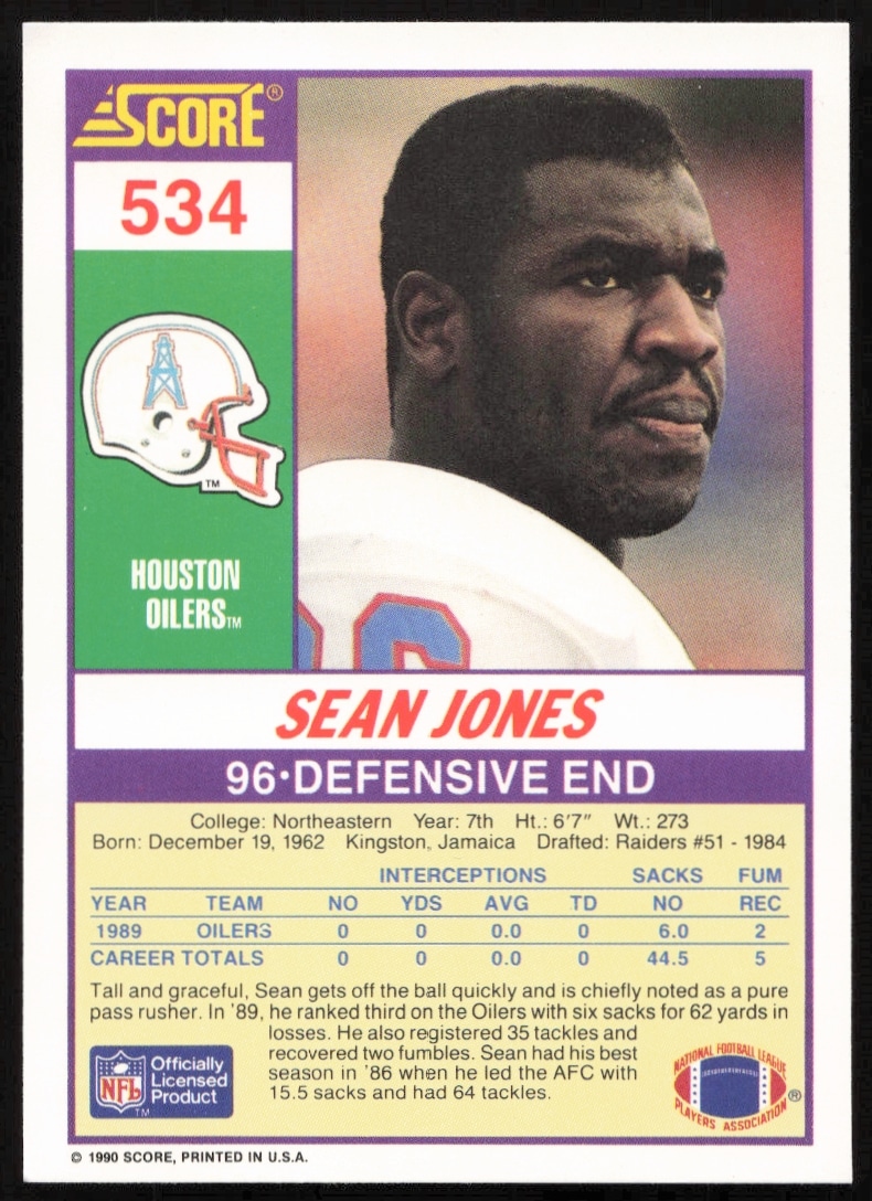 This Football card, from 1990 is part of the Score card set. Sean Jones is featured and has a card number of 534.