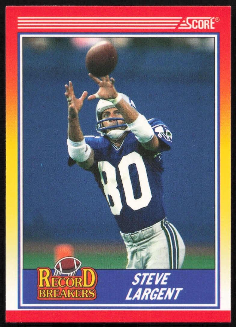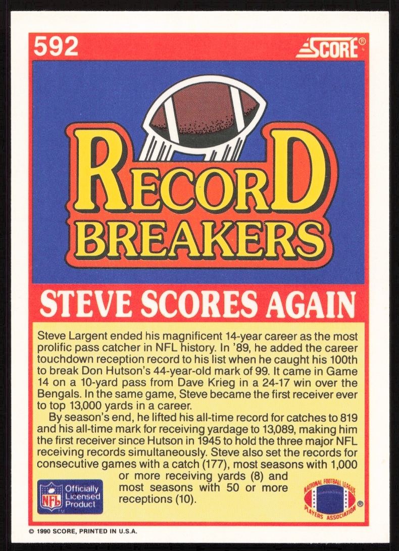 This Football card, from 1990 is part of the Score card set. Steve Largent is featured and has a card number of 592.