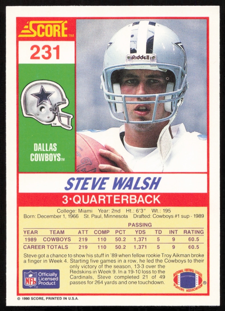 This Football card, from 1990 is part of the Score card set. Steve Walsh is featured and has a card number of 231.