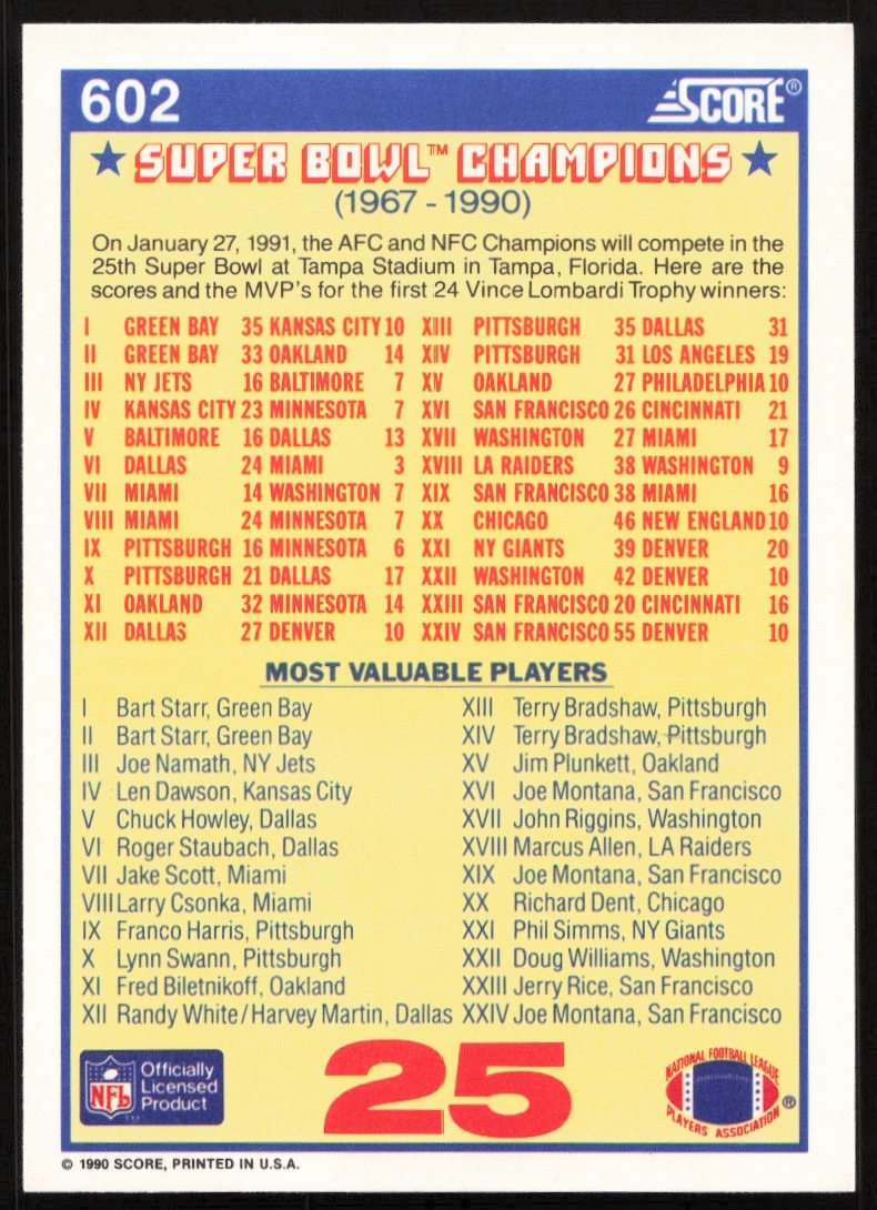 This Football card, from 1990 is part of the Score card set. Super Bowl Wrap is featured and has a card number of 602.