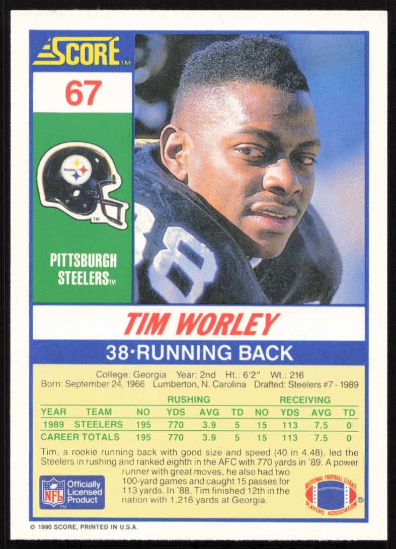 This Football card, from 1990 is part of the Score card set. Tim Worley is featured and has a card number of 67.
