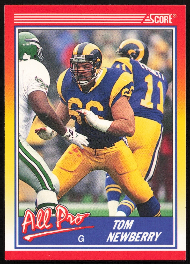 This Football card, from 1990 is part of the Score card set. Tom Newberry is featured and has a card number of 585.
