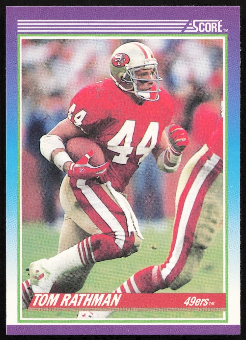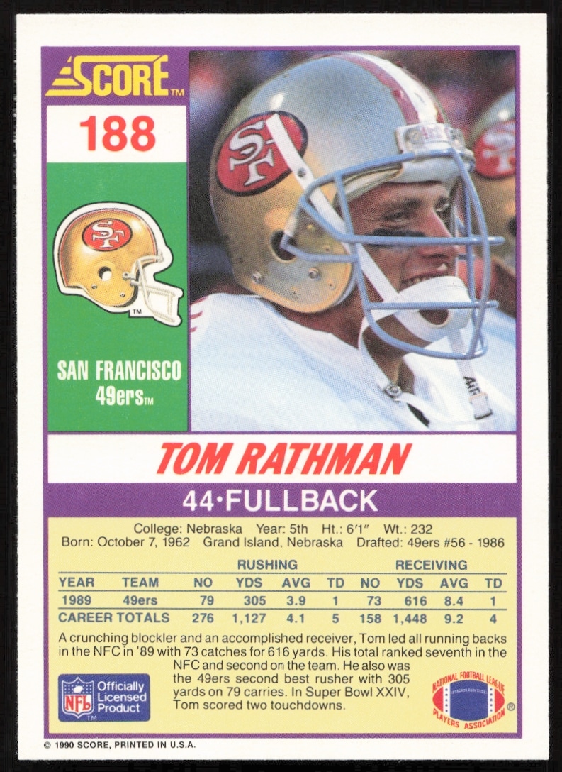 This Football card, from 1990 is part of the Score card set. Tom Rathman is featured and has a card number of 188.