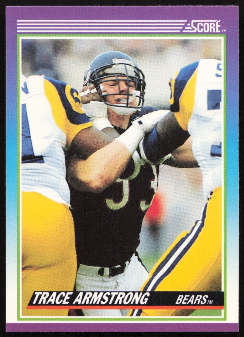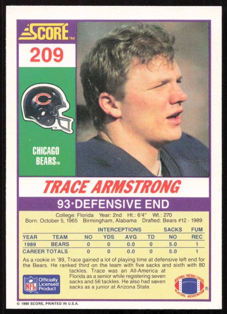 This Football card, from 1990 is part of the Score card set. Trace Armstrong is featured and has a card number of 209.