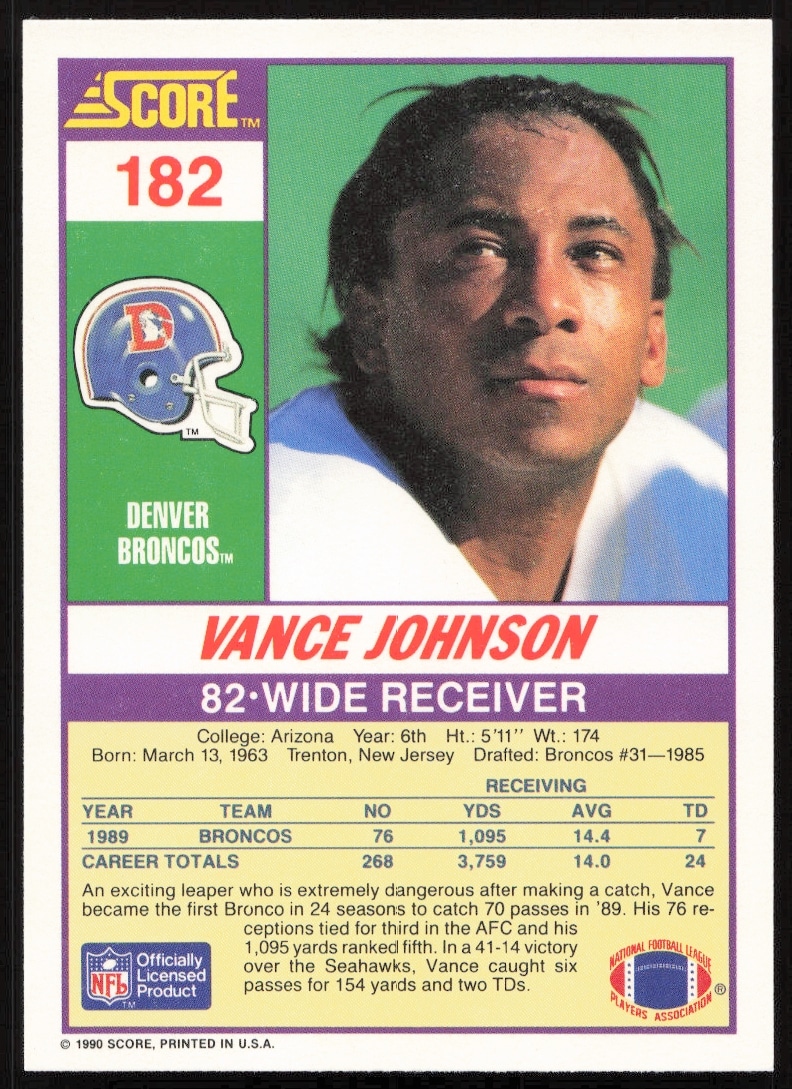 This Football card, from 1990 is part of the Score card set. Vance Johnson is featured and has a card number of 182.