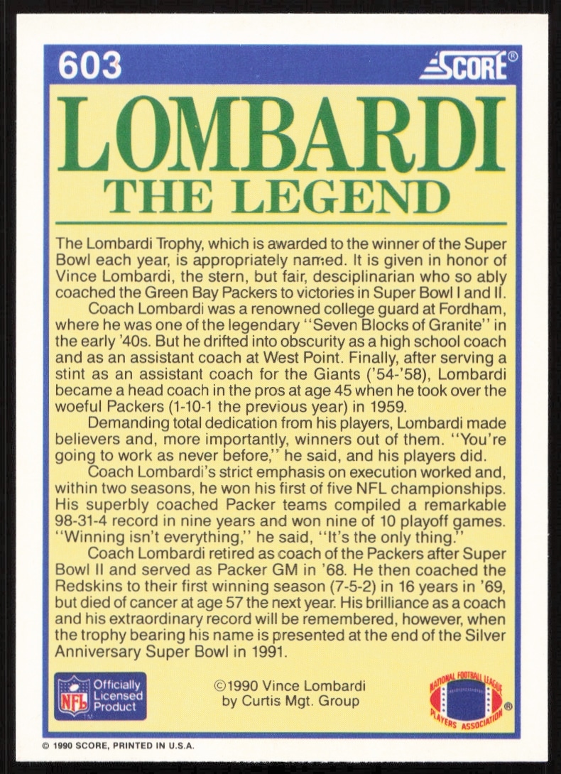 This Football card, from 1990 is part of the Score card set. Vince Lombardi is featured and has a card number of 603.