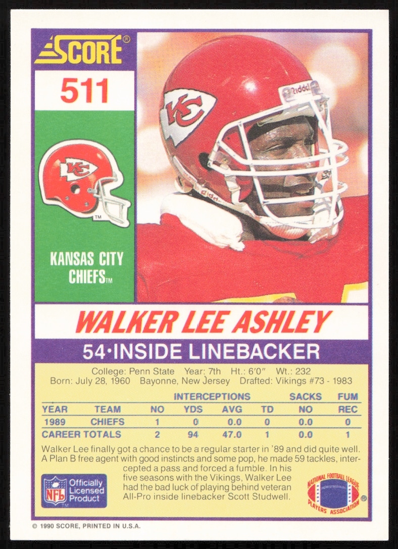 This Football card, from 1990 is part of the Score card set. Walker Lee Ashley is featured and has a card number of 511.