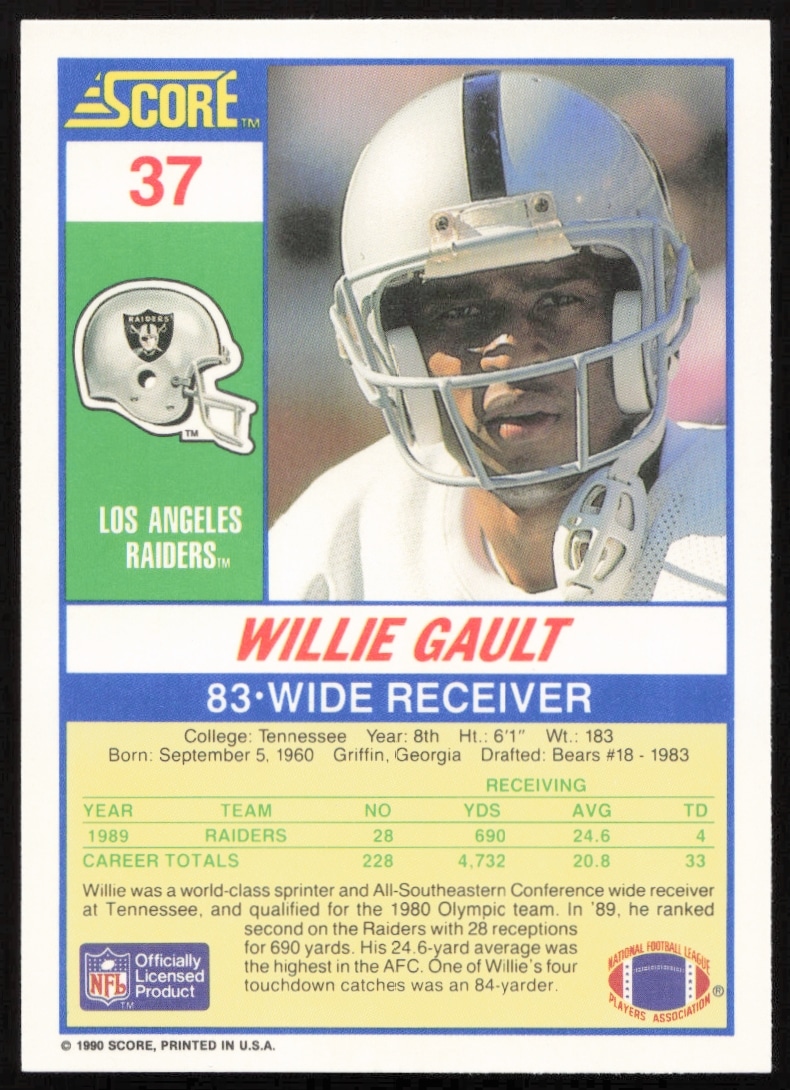 This Football card, from 1990 is part of the Score card set. Willie Gault is featured and has a card number of 37.