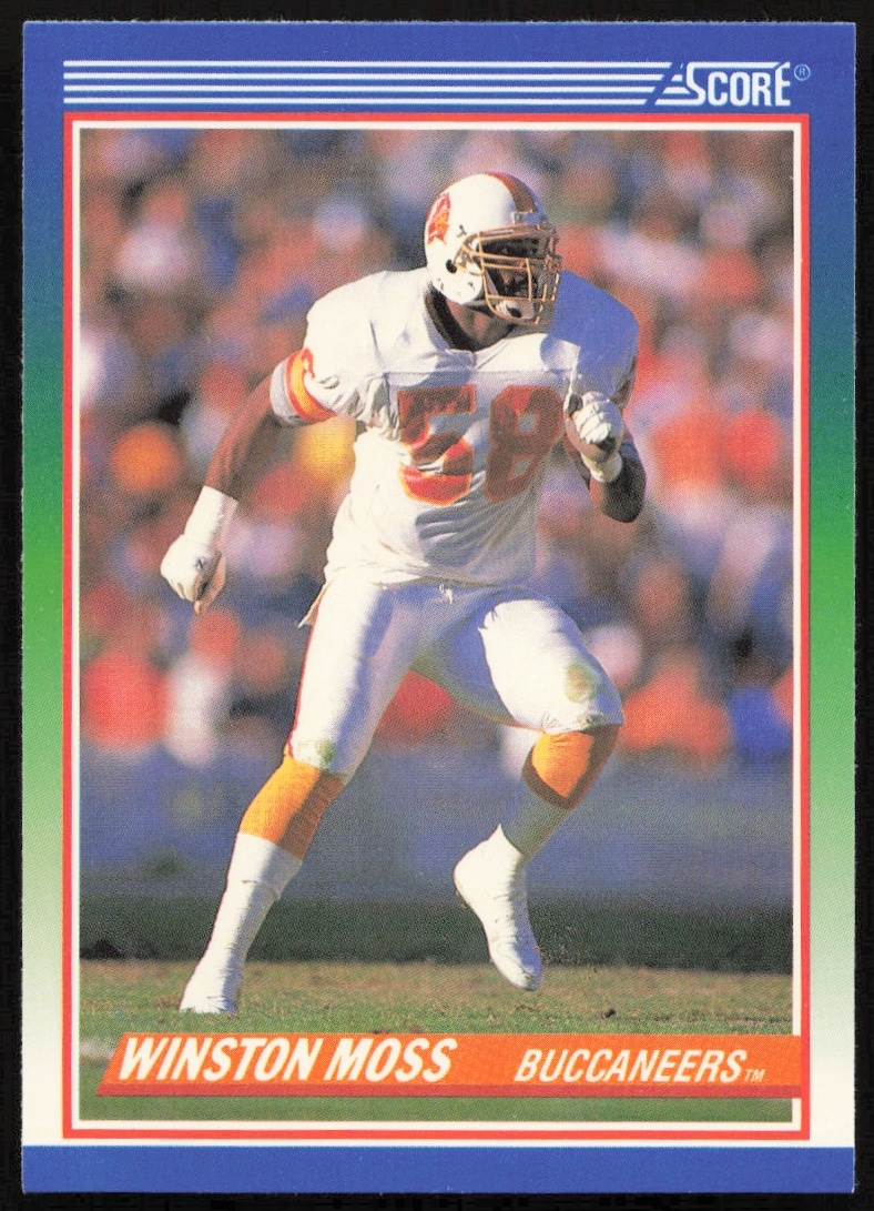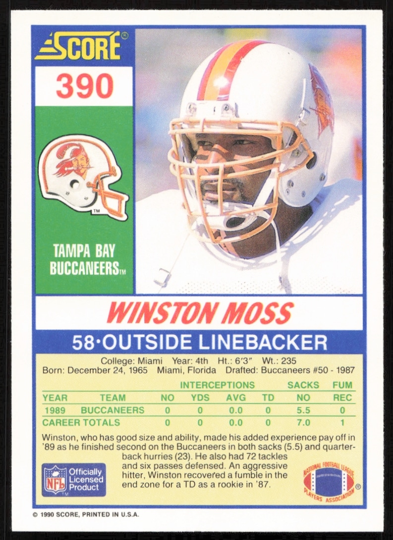 This Football card, from 1990 is part of the Score card set. Winston Moss is featured and has a card number of 390.