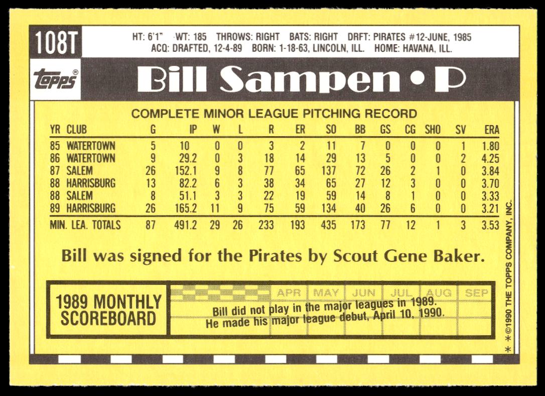 This BaseballΒ card, from 1990 is part of the Topps TradedΒ card set. Bill Sampen is featured and has a card number of 108T.