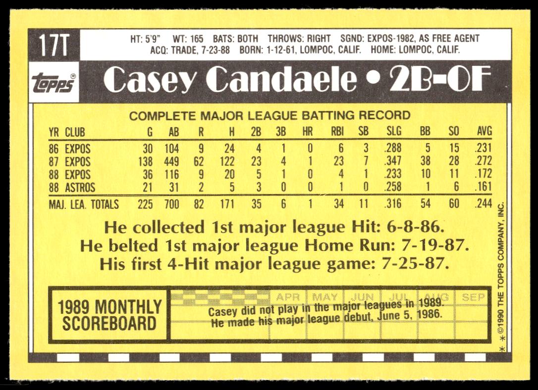 This BaseballΒ card, from 1990 is part of the Topps TradedΒ card set. Casey Candaele is featured and has a card number of 17T.