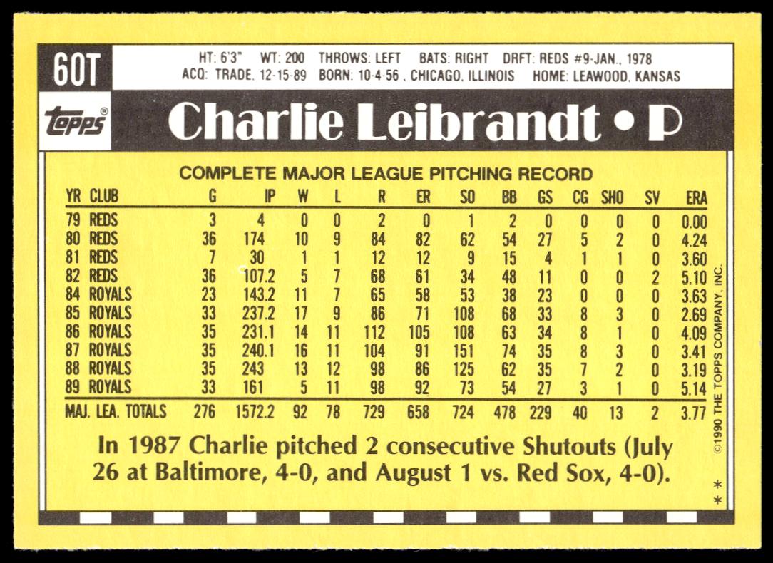This BaseballΒ card, from 1990 is part of the Topps TradedΒ card set. Charlie Leibrandt is featured and has a card number of 60T.