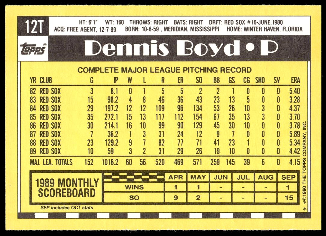 This Baseball card, from 1990 is part of the Topps Traded card set. Dennis Boyd is featured and has a card number of 12T.