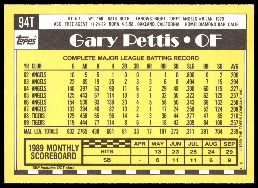 This BaseballΒ card, from 1990 is part of the Topps TradedΒ card set. Gary Pettis is featured and has a card number of 94T.
