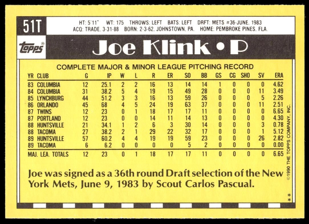 This Baseball card, from 1990 is part of the Topps Traded card set. Joe Klink is featured and has a card number of 51T.