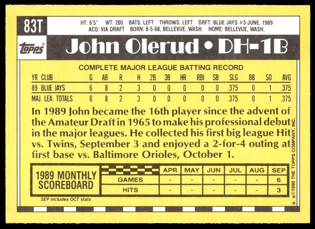 This Baseball card, from 1990 is part of the Topps Traded card set. John Olerud is featured and has a card number of 83T.