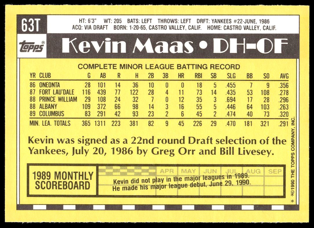 This Baseball card, from 1990 is part of the Topps Traded card set. Kevin Maas is featured and has a card number of 63T.