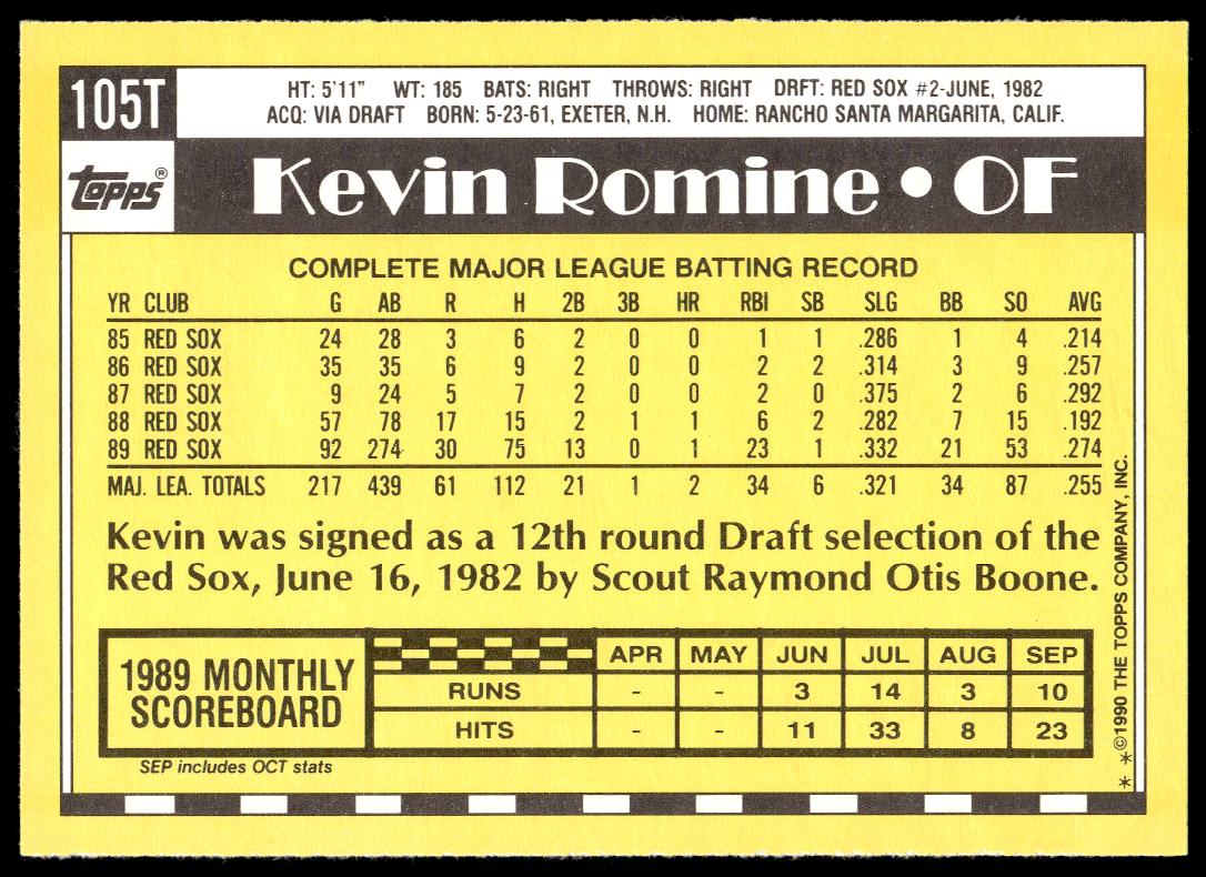This BaseballΒ card, from 1990 is part of the Topps TradedΒ card set. Kevin Romine is featured and has a card number of 105T.