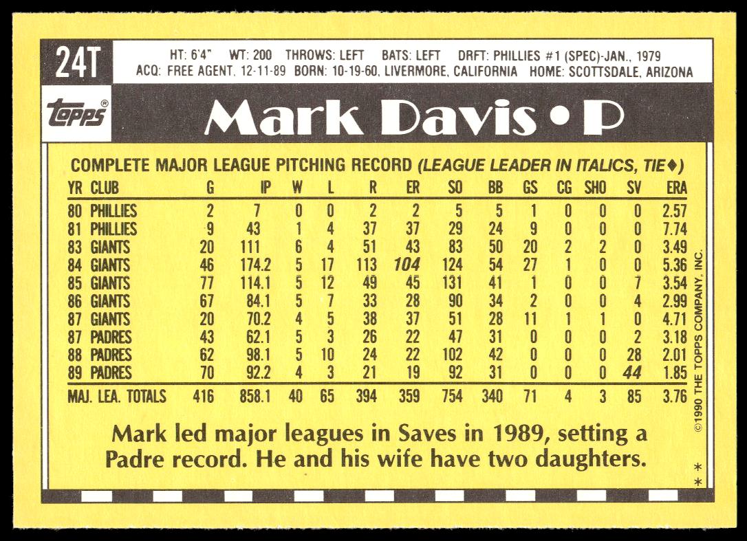 This Baseball card, from 1990 is part of the Topps Traded card set. Mark Davis is featured and has a card number of 24T.