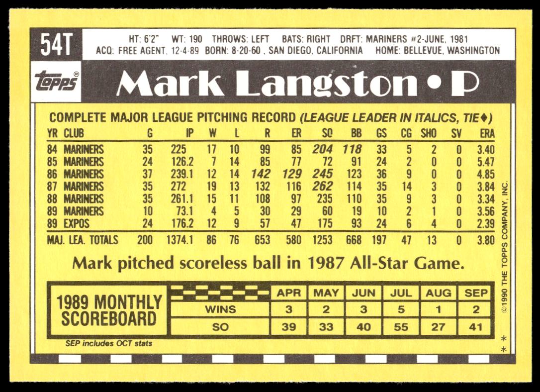 This BaseballΒ card, from 1990 is part of the Topps TradedΒ card set. Mark Langston is featured and has a card number of 54T.