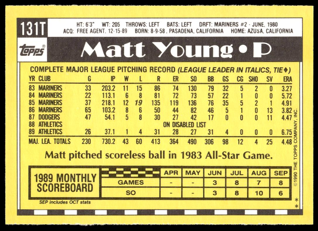This BaseballΒ card, from 1990 is part of the Topps TradedΒ card set. Matt Young is featured and has a card number of 131T.