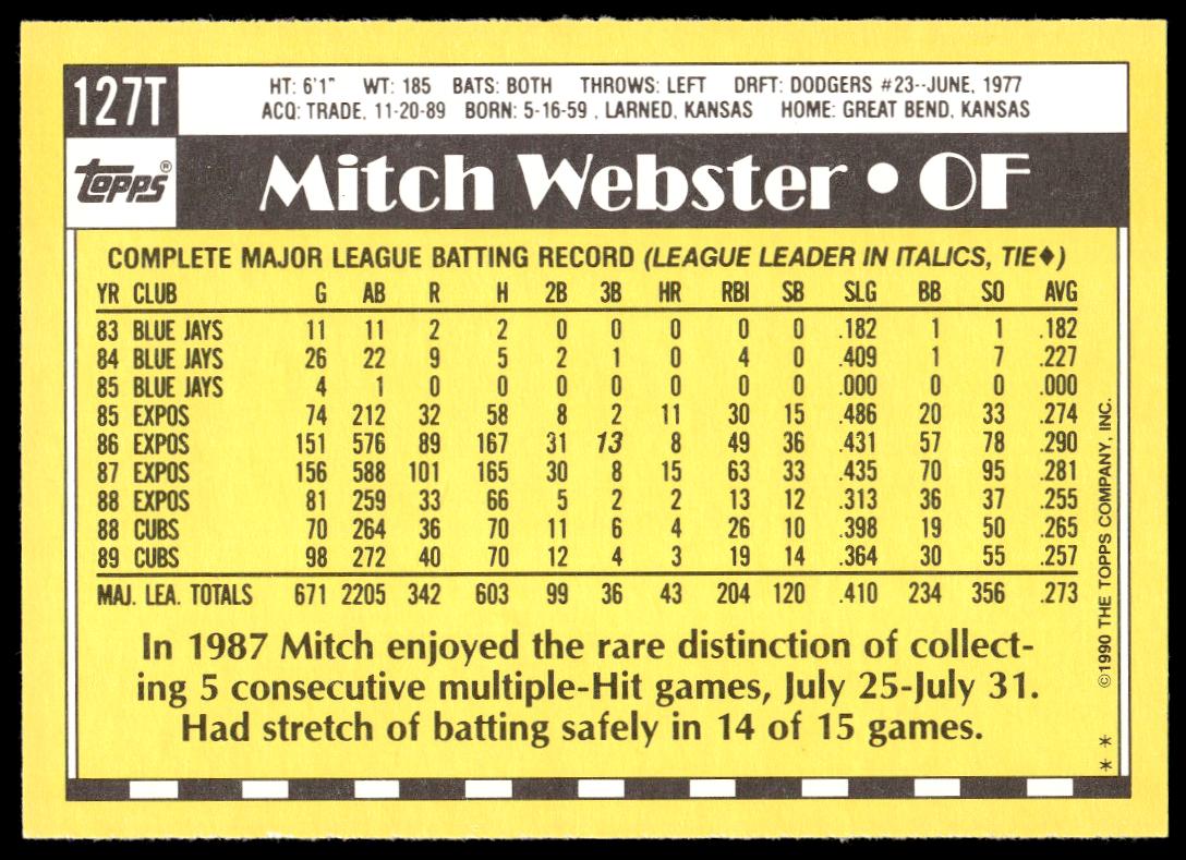 This BaseballΒ card, from 1990 is part of the Topps TradedΒ card set. Mitch Webster is featured and has a card number of 127T.