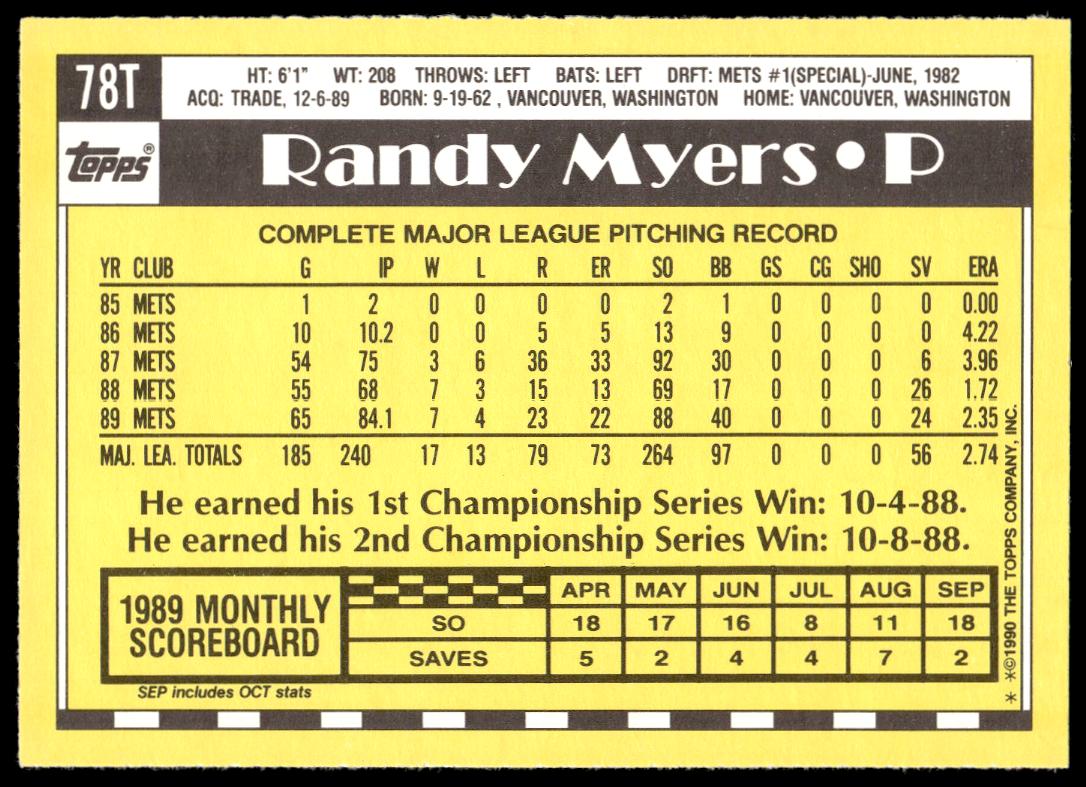 This BaseballΒ card, from 1990 is part of the Topps TradedΒ card set. Randy Myers is featured and has a card number of 78T.