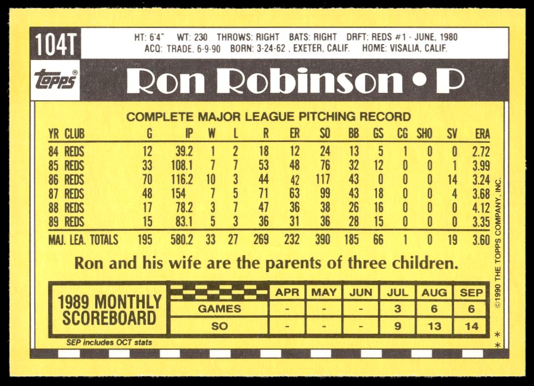 This BaseballΒ card, from 1990 is part of the Topps TradedΒ card set. Ron Robinson is featured and has a card number of 104T.