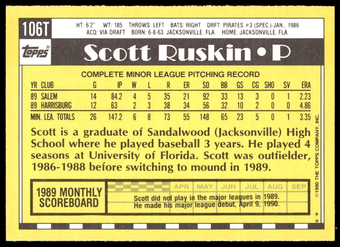 This BaseballΒ card, from 1990 is part of the Topps TradedΒ card set. Scott Ruskin is featured and has a card number of 106T.