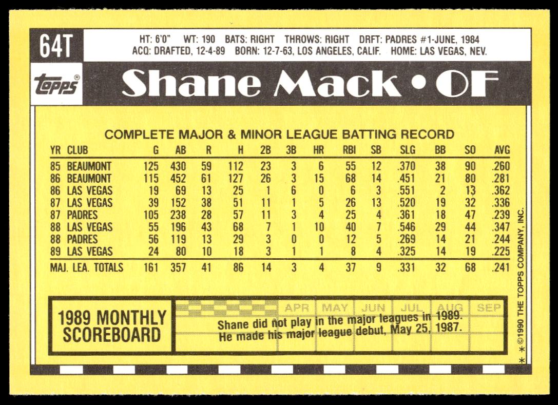 This Baseball card, from 1990 is part of the Topps Traded card set. Shane Mack is featured and has a card number of 64T.