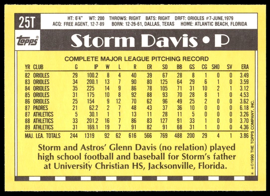 This BaseballΒ card, from 1990 is part of the Topps TradedΒ card set. Storm Davis is featured and has a card number of 25T.