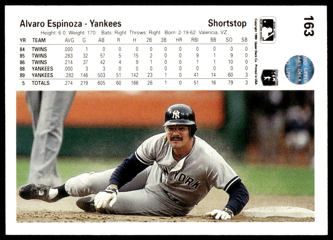 This BaseballΒ card, from 1990 is part of the Upper Deck Β card set. Alvaro Espinoza is featured and has a card number of 163.