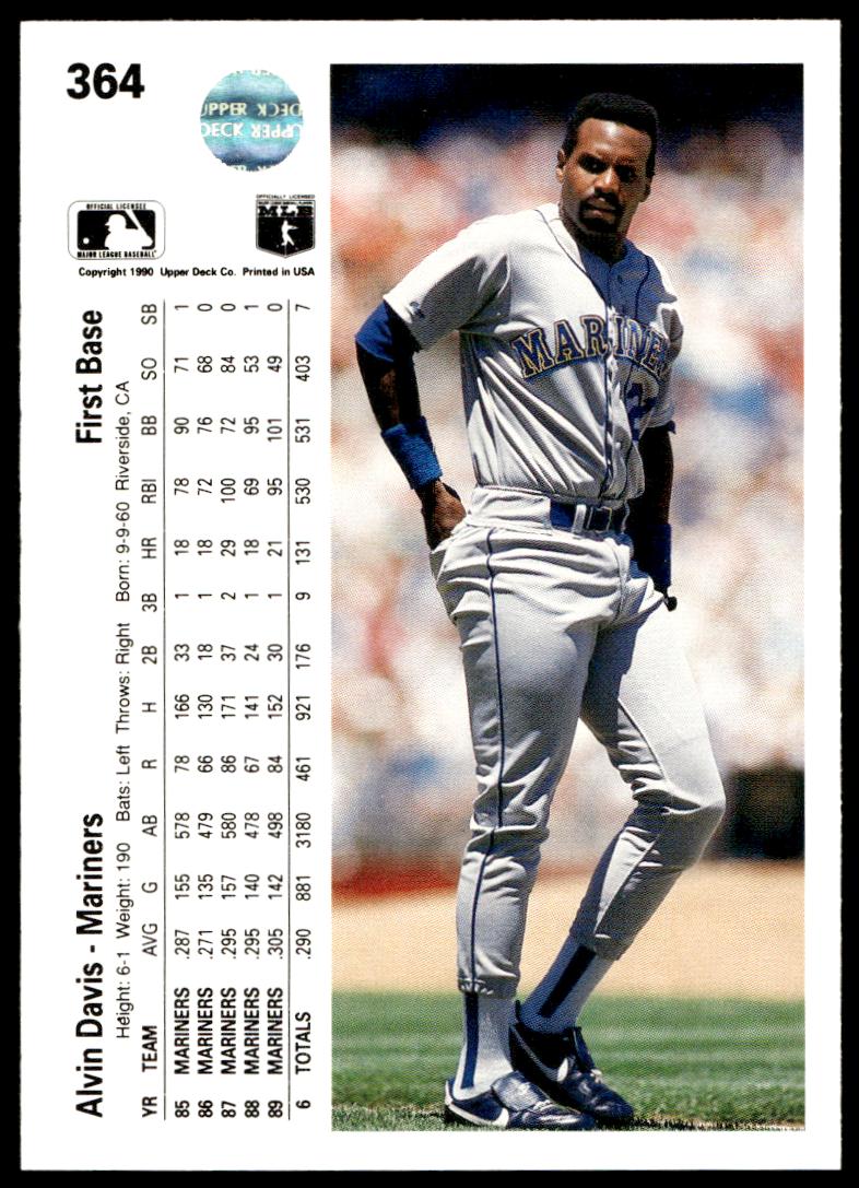 This Baseball card, from 1990 is part of the Upper Deck  card set. Alvin Davis is featured and has a card number of 364.