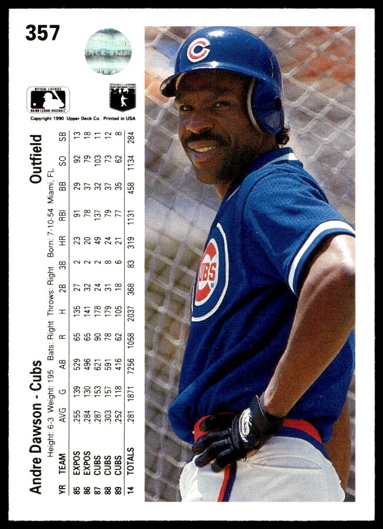 This Baseball card, from 1990 is part of the Upper Deck  card set. Andre Dawson is featured and has a card number of 357.