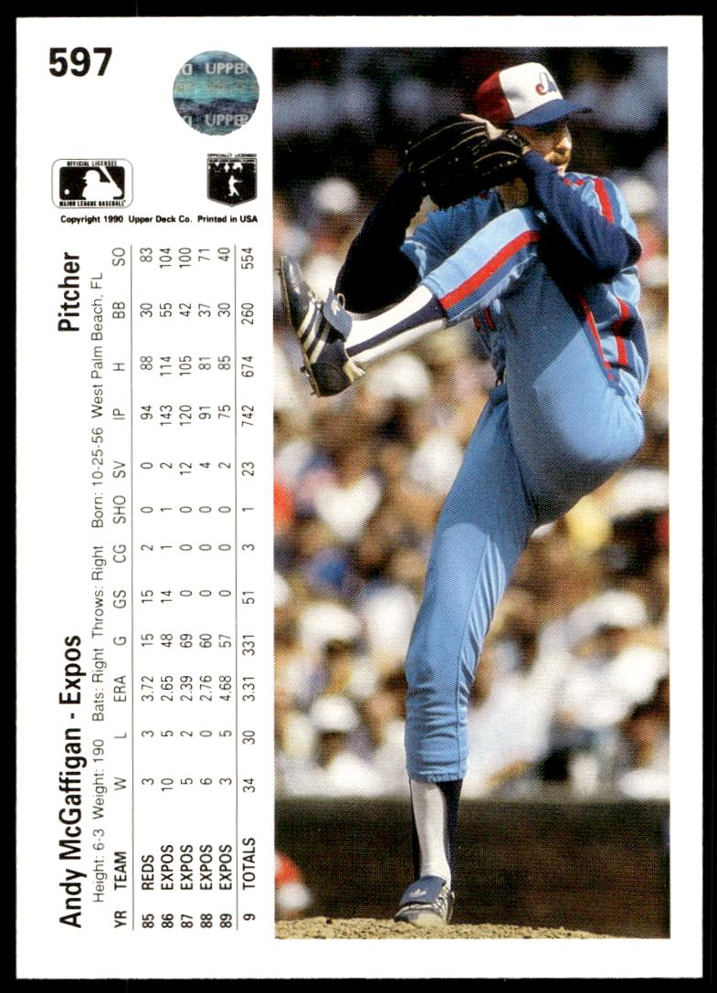 This Baseball card, from 1990 is part of the Upper Deck  card set. Andy McGaffigan is featured and has a card number of 597.