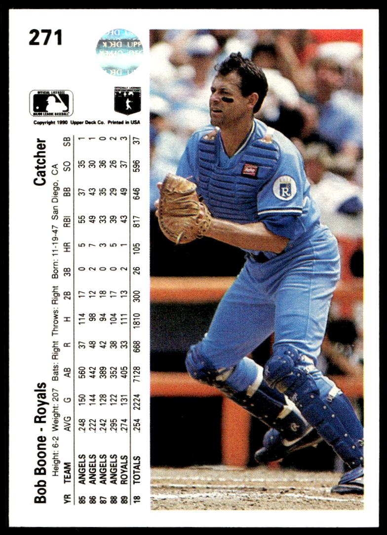 This Baseball card, from 1990 is part of the Upper Deck  card set. Bob Boone is featured and has a card number of 271.