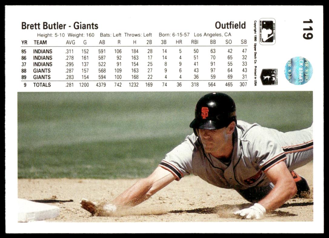 This Baseball card, from 1990 is part of the Upper Deck  card set. Brett Butler is featured and has a card number of 119.
