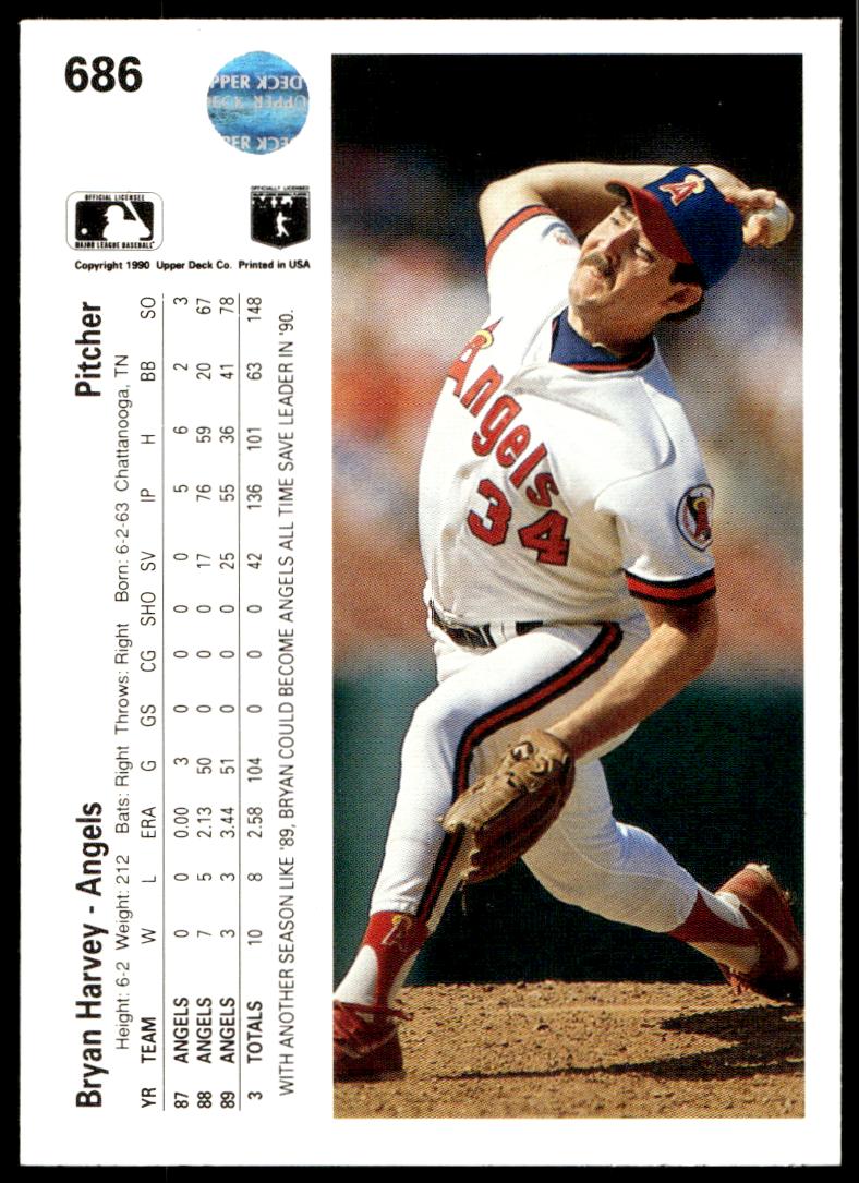 This Baseball card, from 1990 is part of the Upper Deck  card set. Bryan Harvey is featured and has a card number of 686.