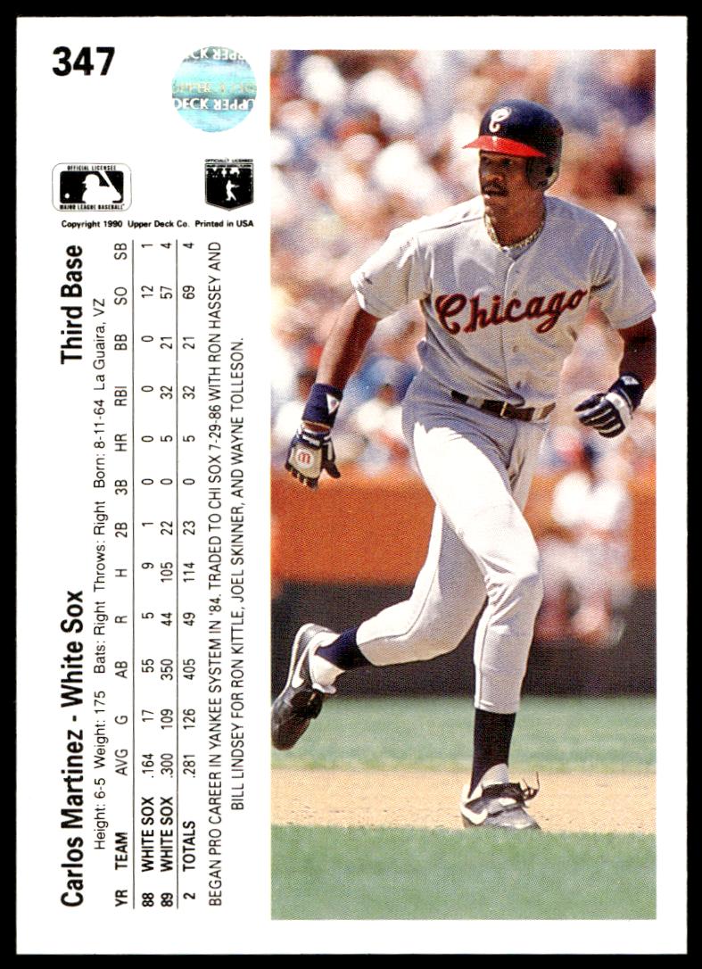 This BaseballΒ card, from 1990 is part of the Upper Deck Β card set. Carlos Martinez is featured and has a card number of 347.