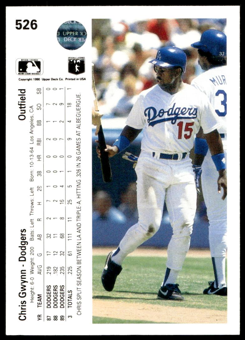 This Baseball card, from 1990 is part of the Upper Deck  card set. Chris Gwynn is featured and has a card number of 526.