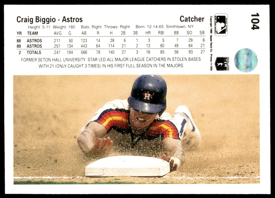 This Baseball card, from 1990 is part of the Upper Deck  card set. Craig Biggio is featured and has a card number of 104.