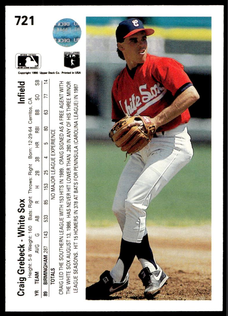This BaseballΒ card, from 1990 is part of the Upper Deck Β card set. Craig Grebeck is featured and has a card number of 721.
