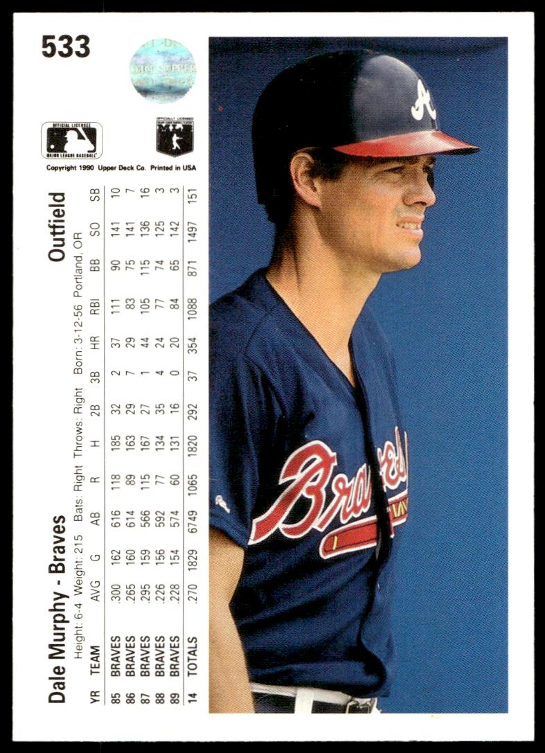 This Baseball card, from 1990 is part of the Upper Deck  card set. Dale Murphy is featured and has a card number of 533.