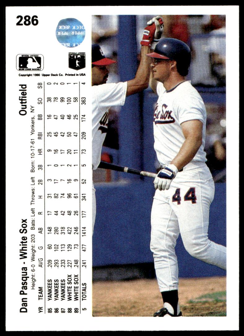 This Baseball card, from 1990 is part of the Upper Deck  card set. Dan Pasqua is featured and has a card number of 286.