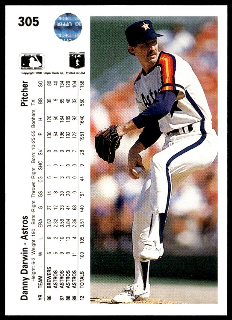 This Baseball card, from 1990 is part of the Upper Deck  card set. Danny Darwin is featured and has a card number of 305.
